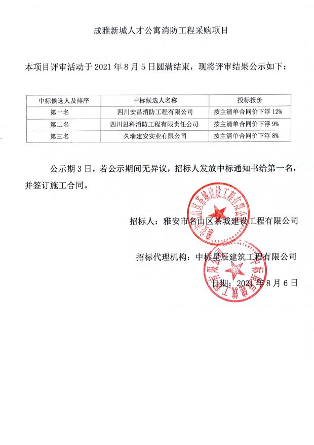 成雅新城人才公寓消防工程采購項(xiàng)目中標(biāo)公示