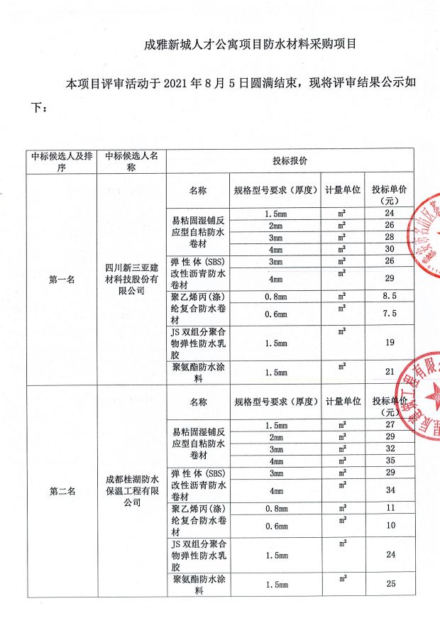 成雅新城人才公寓項(xiàng)目防水材料采購中標(biāo)公示