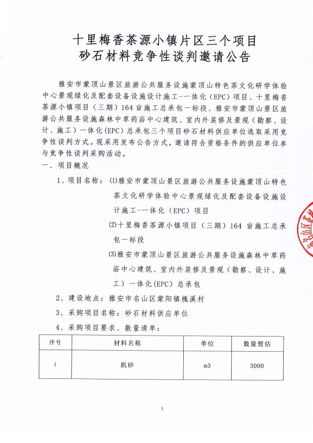 十里梅香茶源小鎮(zhèn)片區(qū)三個項目砂石材料競爭性談判邀請公告